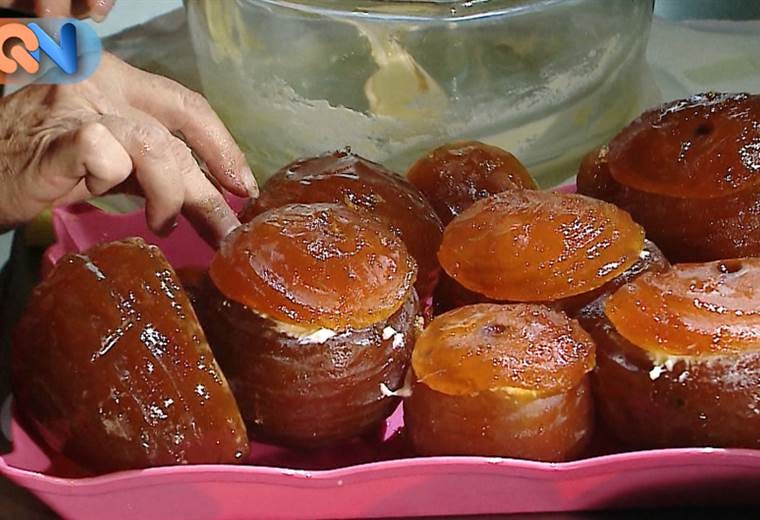 It's prepared by removing the grapefruit zest, slicing the top off and boiling both pieces. The insides are then hollowed out, and it's filled with a dulce de leche mixture. There are many more steps but I couldn't find a recipe that is not in Spanish and I'm running out of time! If you wanna see them made, here's a video.
